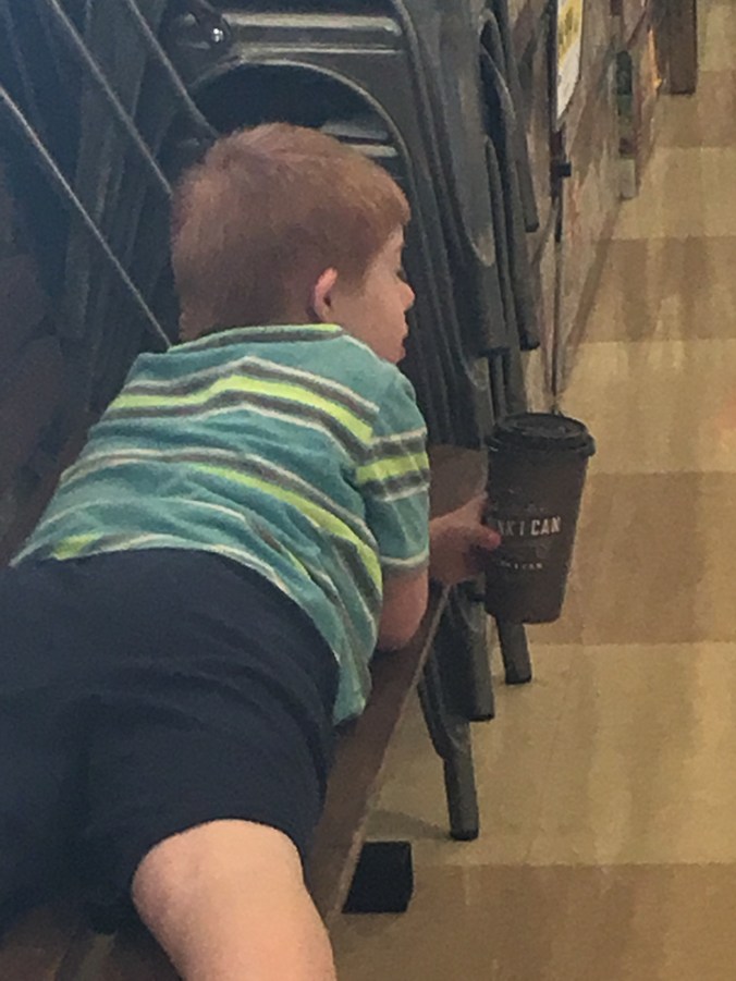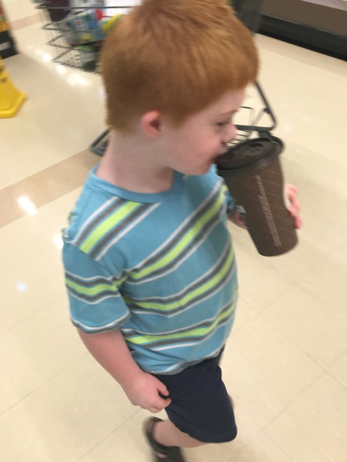I am not kidding. If I control where the cup rests, then he doesn’t run. The way I doctor my coffee is how he likes it too. He asks for a sip. Smiles. Walks with me and gets some items I ask him to get and asks for another sip. If he sees someone he wants to say “How you doin?” in his own way, then he does. And comes back for another sip.