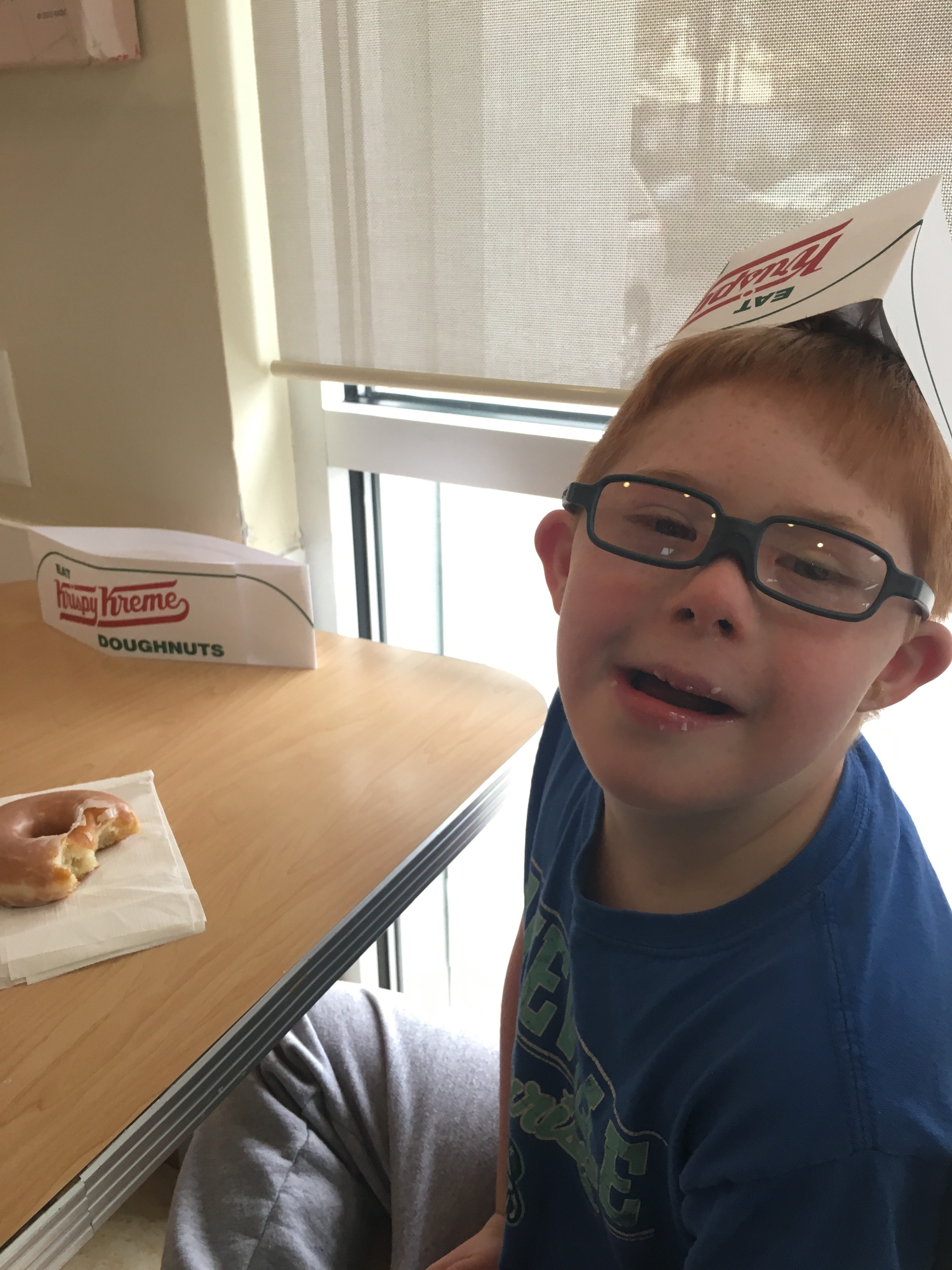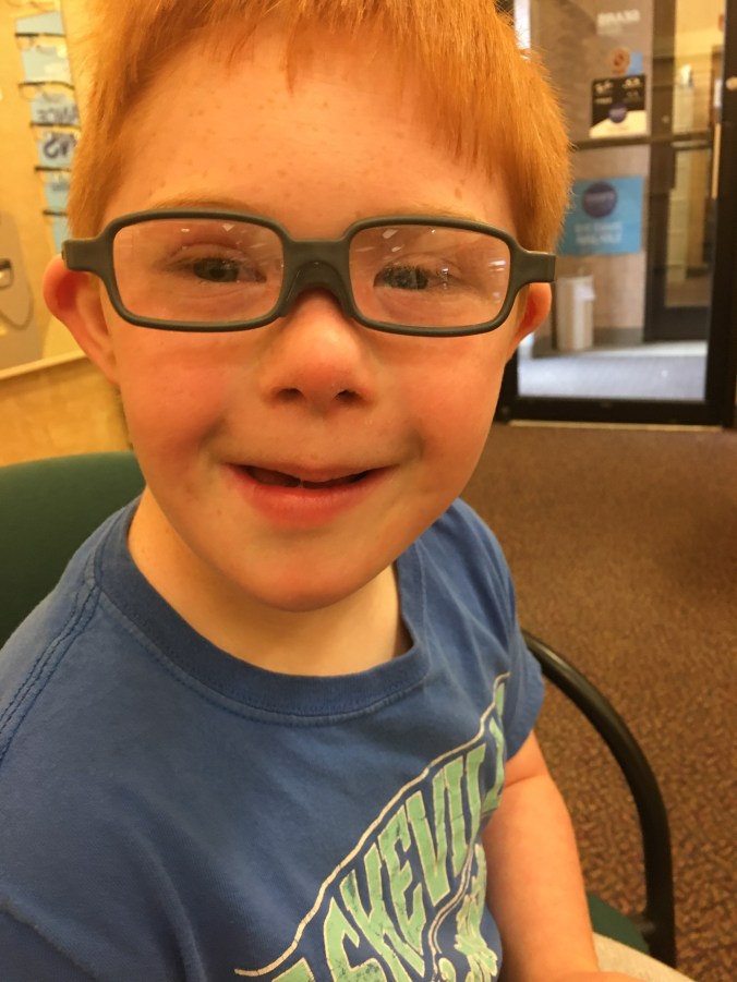 Grandma won these frames at the Buddy Walk. Mom took him to get them lenses. I got to pick them up with the little man. And he likes them.
