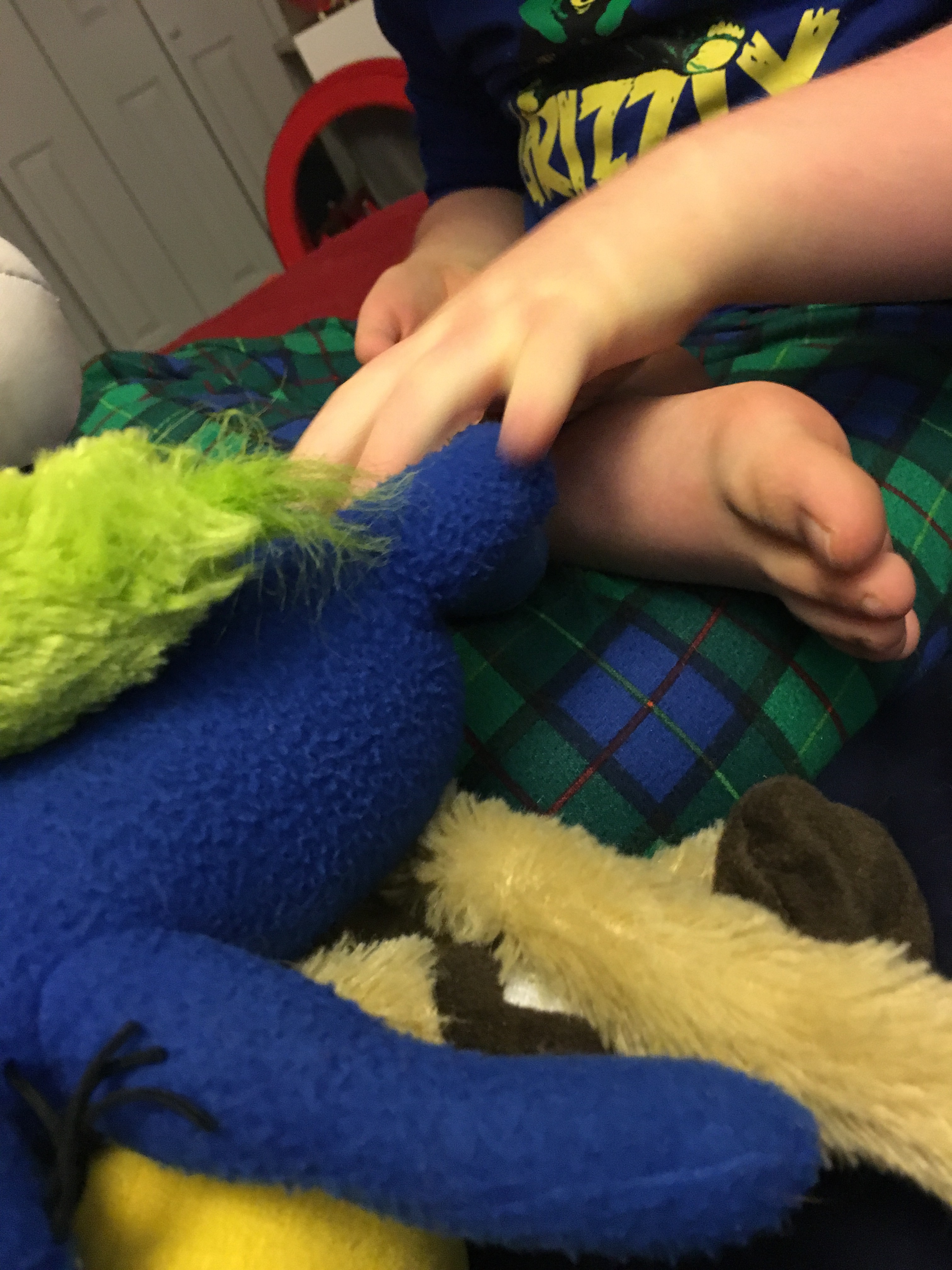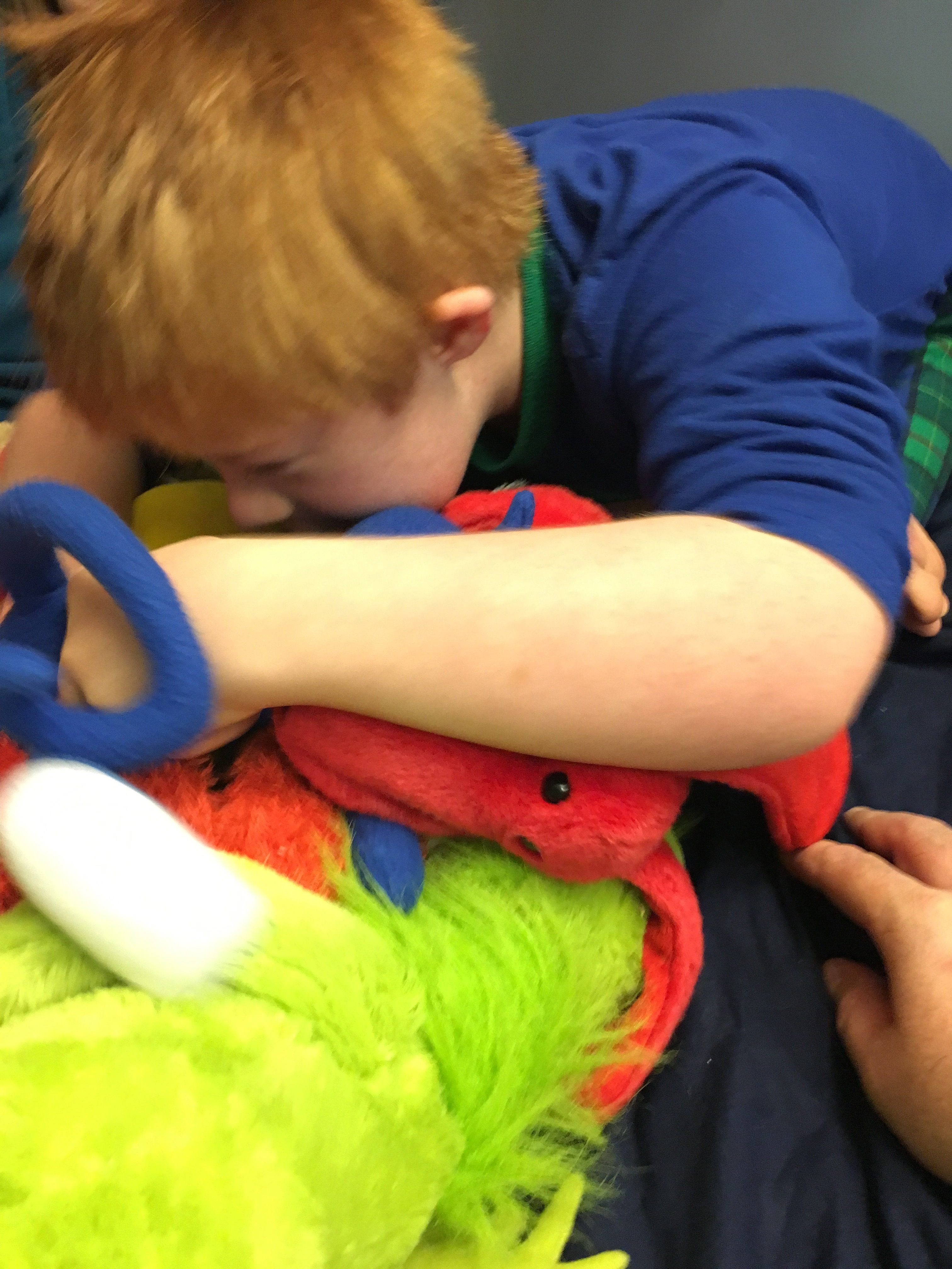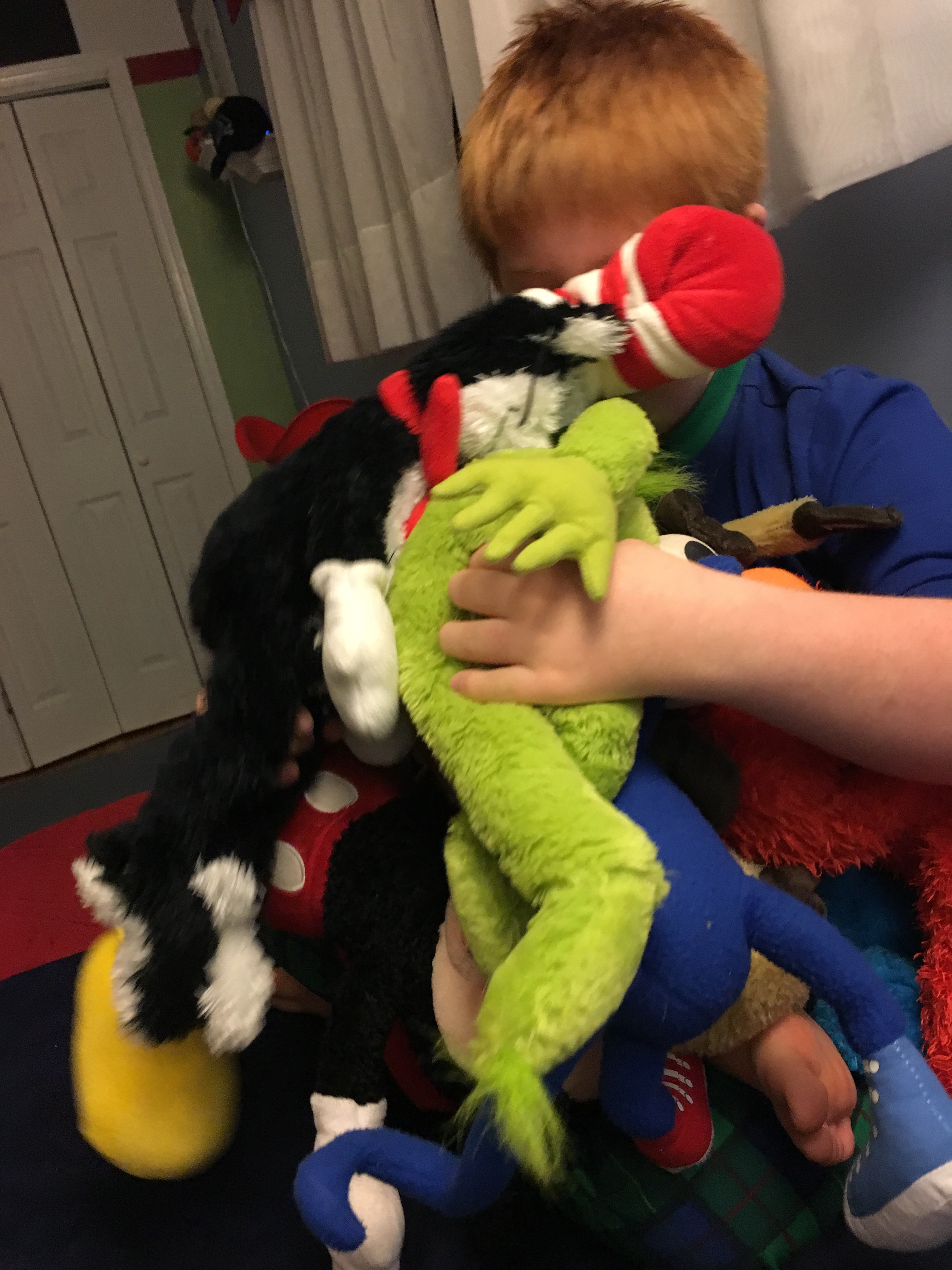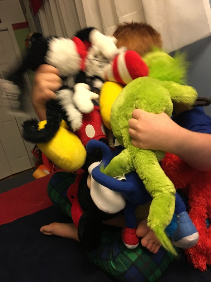 He literally stacks them on top of each other almost artistically. He carefully places one stuffed animal on top of others, rearranges them to get the perfect combination, and then tilts his head from side to side in earnest analysis, and then revises his original pile.