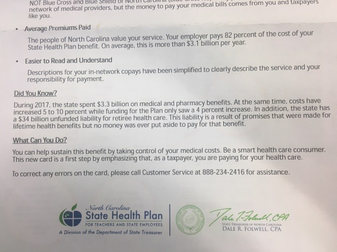 Many teachers and other state employees received those words from Dale Folwell, CPA who is also the State Treasurer for North Carolina. He sent a letter with new ID cards for the state health plan that is contracted through Blue Cross and Blue Shield.