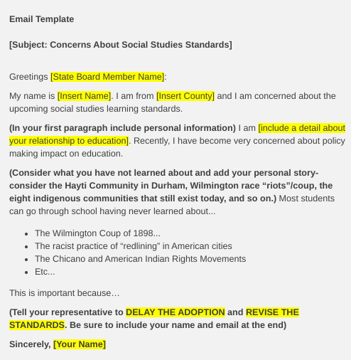 - We need 20 people within the next 24 hours to contact the state boardregarding the newly drafted social studies learning standards and how it perpetuates curriculum violence in North Carolina public schools as well as the cultural erasure of our students and their families of color. There are many pages and three different courses (American History, World History & Founding Principles), but as you peruse any of the PDFs, please note what you see related to Black, Latinx, Native American and Asian communities in NC. Are the lives and experiences of communities of color lifted up? Now more than ever we have to make sure we teach histories that are inclusive representative of various cultures.