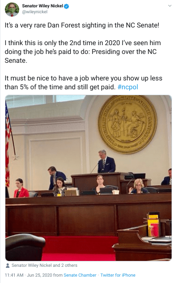 Lt Gov. Dan Forest has been at work fewer days in 2020 than most people have fingers on their left hand.