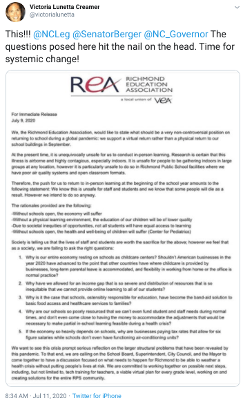 The following tweet references a letter from the Richmond Education Association a chapter of the Virginia Association of Educators. (Compliments to Victoria Lunetta Creamer for the tweet).