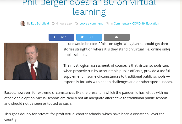 This “aboutface” has happened in NC as well with Senator Phil Berger. This morning Rob Schofield from NC Policy Watch released a post today that is very much worth the read. Entitled “Phil Berger does a 180 on virtual learning,” Schofield calls out the hypocrisy of the lawmaker.