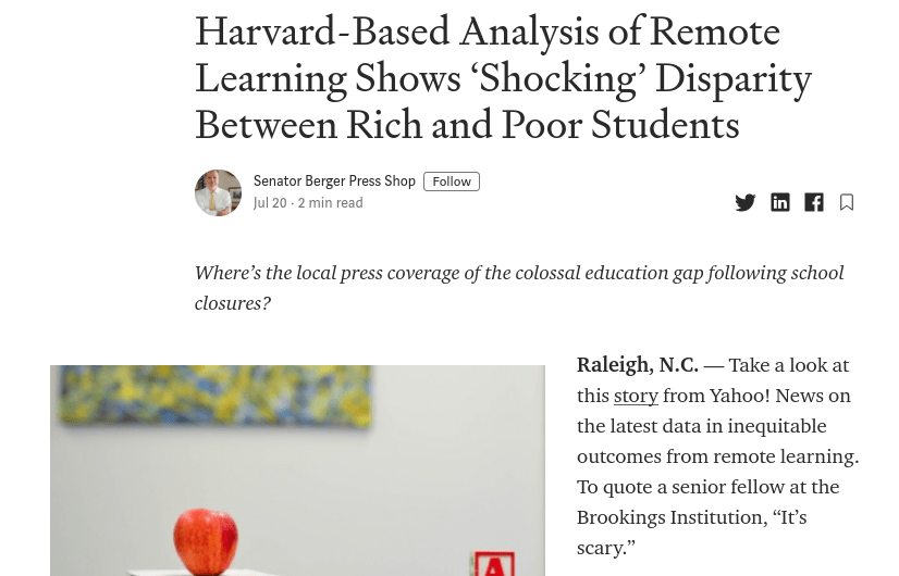 And now comes Senator Phil Berger (or his staff, anyway) in a new post on the website Medium warning readers about the terrible threat that virtual education poses to — we’re not making this up — poor kids. In the post, Berger cites a recent story on Yahoo! News that highlighted research by pointy-headed liberals at Harvard in which they documented the challenges that virtual education poses to low-income kids.