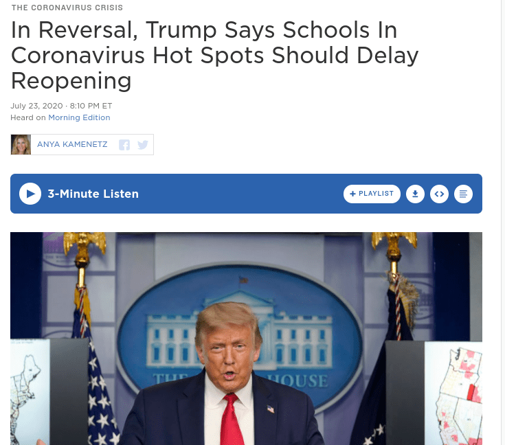 Late this past week, President Trump signaled a bit of a reversal of his hard-lined stance on all schools reopening.