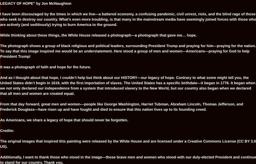 The photograph shows a group of black religious and political leaders, surrounding President Trump and praying for him—praying for the nation. To say that this image inspired me would be an understatement. Here stood a group of men and women—Americans—praying for God to help President Trump!