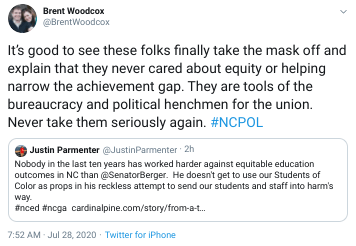 That’s actually hilarious. Why? First, this conveys the absolute fear that Berger and his cronies have for organized teachers fighting for better public schools. Secondly, Justin Parmenter is right that “nobody in the last ten years has worked harder against equitable education outcomes in NC than Senator Berger.”