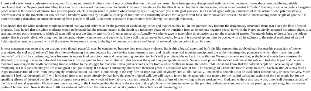 Just read it or re-read it. When MLK, Jr. was fighting for equal rights, much of what he confronted was dealing with those people who talked a “good game” while cloaked in “holy robes” but whose actions said otherwise.