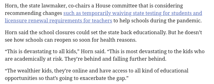 You never seem to explain that in your comment, Rep. Horn. Consider that literally overnight schools and teachers had to switch from in-person to remote learning without the technological support and training that any transition would need.