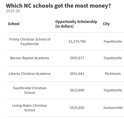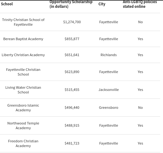 There are other interactive data tables / maps in that news report which provide rather insightful data, but what is most apparent is that North Carolina allows for a voucher system that funds discrimination and homophobia.