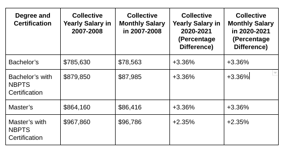If all of those teachers (still with the differences in experience) had a master’s degree, their collective salary would be $864,160 or $86,416/month. If they all had a master’s and national certification that total would be $967,860 or $96,786/month.