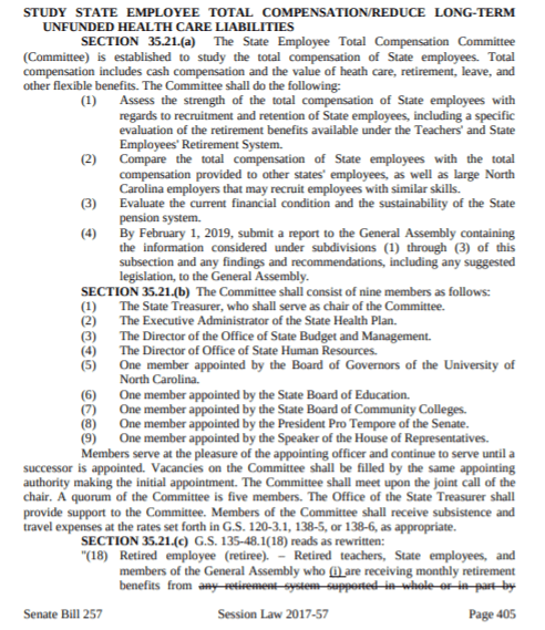 A report today in the News & Observer explains that the budget set forth in 2017’s long session of the NCGA did away with retiree health benefits for hires on and after January 1, 2021 to “save money.”