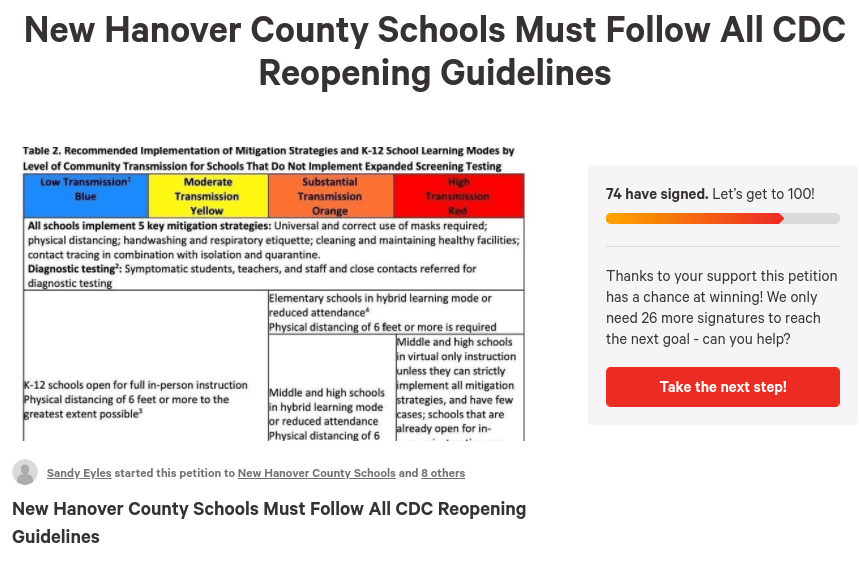 According to the updated guidelines, communities in the Orange (Substantial Transmission) and Red (High Transmission) zones, Elementary Schools must operate “in hybrid learning mode or reduced attendance. Physical distancing of 6 feet or more is required.” At the time of writing this petition, New Hanover County has 311 cases per 100,000 residents over the past 7 days. This puts us in the Red Zone (High Transmission). We also have a percent positive of 8% which puts us in the Orange Zone (Substantial Transmission). To comply with CDC guidance, NHCS must adapt their in person learning plan to support reduced attendance and social distancing at 6 ft. apart.