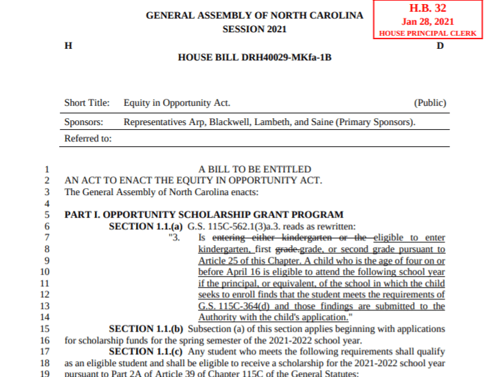 An “Opportunity Grant” in North Carolina is worth up to $4200 a year to cover (or help cover) tuition at a non-public participating school.