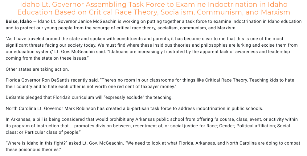 Idaho Lt. Governor Janice McGeachin is working on putting together a task force to examine indoctrination in Idaho education and to protect our young people from the scourge of critical race theory, socialism, communism, and Marxism.