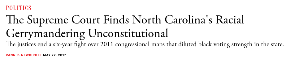 “In the decision in Cooper v. Harris, the eight-member pre-Gorsuch roster upheld a district court’s ruling that two congressional districts in North Carolina were unconstitutional racial gerrymanders, putting an end to one part of a six-year saga that began with redistricting in 2011.“