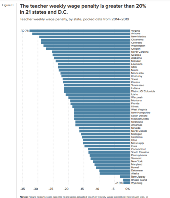 For the past several years, the Economic Policy Institute releases a report on what they call the “teacher pay penalty” Here is their most recent recent edition of its report on teacher pay in comparison to other college graduates before the pandemic set in.