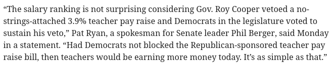 NCGA GOP stalwarts like Sen. Berger’s spokeperson are trying to frame the narrative that Gov. Cooper and NCGA Senate Democrats placed teachers on the chopping block because they upheld a veto on what was presented as a 3.9% average raise in teacher salaries a couple of years ago.