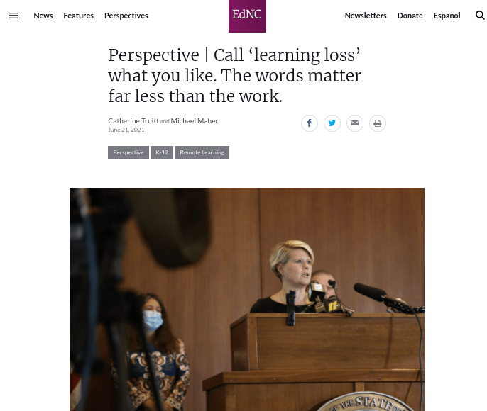 About a month ago, Supt. Catherine Truitt co-authored an op-ed that appeared in EdNC.org entitled “Call ‘learning loss’ what you like. The words matter far less than the work.”