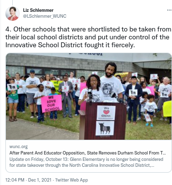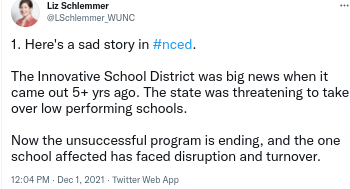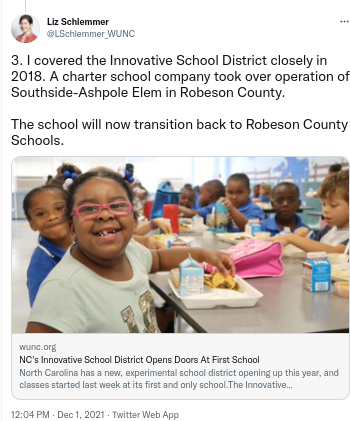 An “innovative” school district run by an out-of-state for-profit charter chain that employed the NC rep who pushed it through the NCGA with a voice vote presided over by Sen. Jerry Tillman that still has only one school was then on its third superintendent and its second principal.