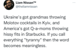 When Ukrainian men between the ages of 18 and 60 are required to stay in the country and fight for their land and there seems to be no complaints whatsoever, but here in America we see full tantrums from grown men at stores screaming about how mask mandates impinge on their freedoms, how am I as a teacher supposed to allow students to “speak” freely about these world events?