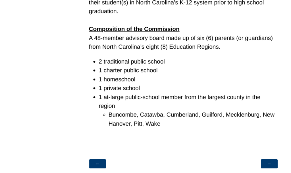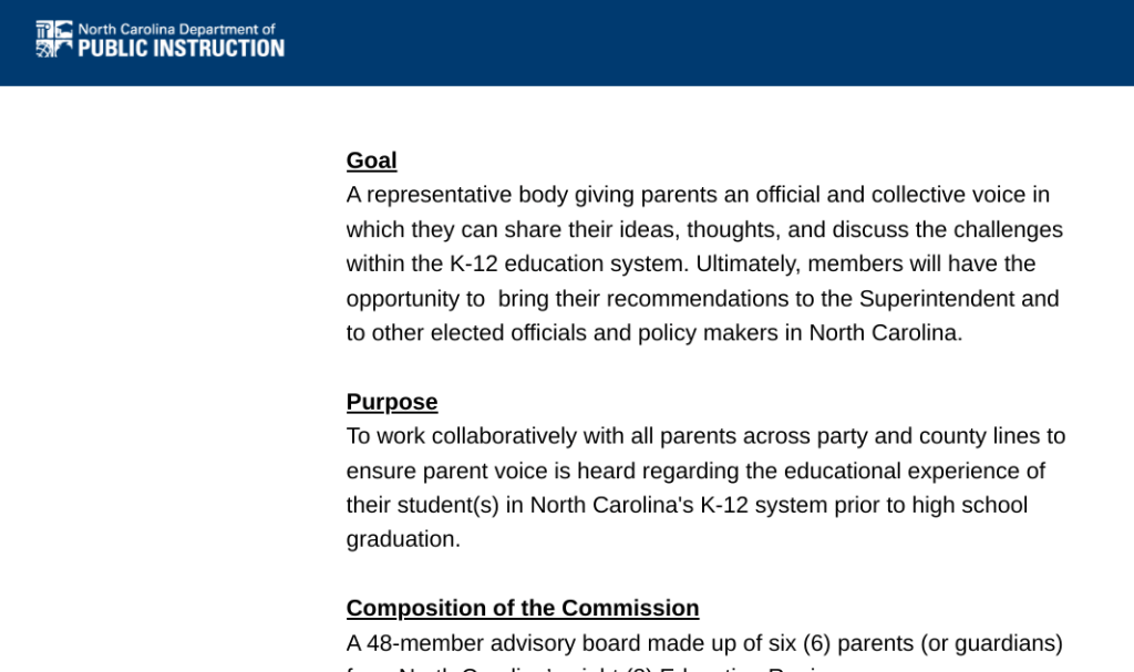 Six parents from eight different “education regions” will be appointed from the application process to “help put together recommendations for elected officials and policy makers in North Carolina.”