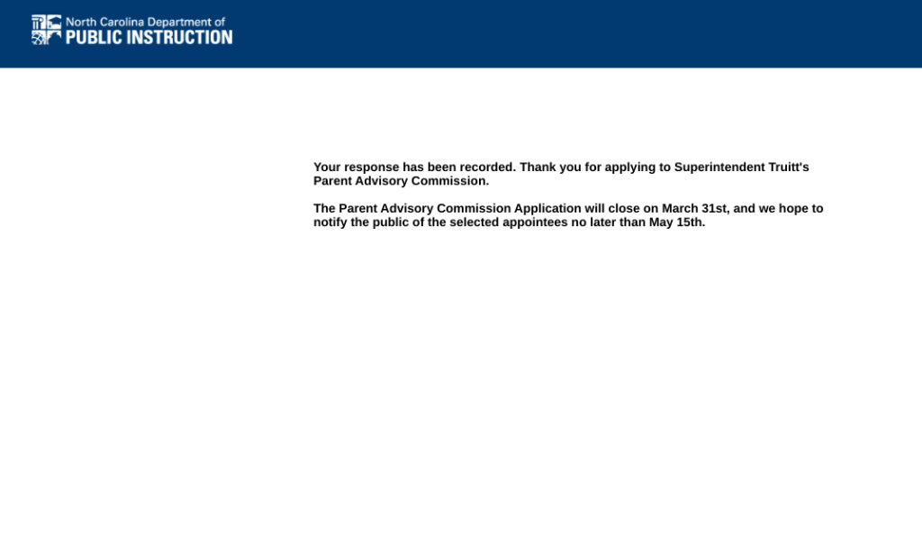 Below are screen shots of the application process for the Parent Advisory Commission set up by Superintendent Catherine Truitt.