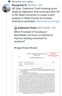 Interesting that our State Supt. Catherine Truitt would fight to get this $10K diverted from diversity in “pickleball” in Wake County in order to score score some political points and public publicity when she cannot even acknowledfge some other glaring truths.