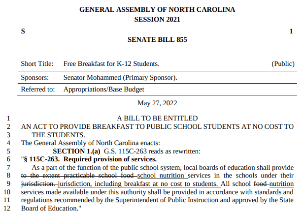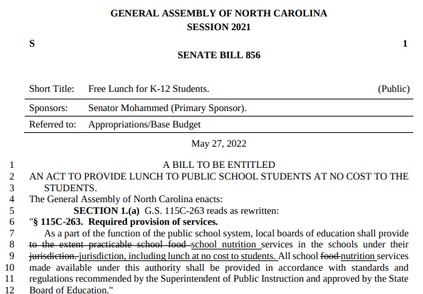 As the short session for the North Carolina General Assembly got started a few days ago, a couple of senate bills were filed that would continue the availability of free breakfasts and lunches for public school students in the state.