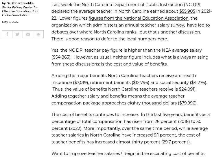 The “added costs” of benefits is also an argument that the people at the John Locke Foundation like to trumpet. As long time adversaries of the public education system in NC and especially NCAE, they frequently argue that if teachers want more income, then they should cut out some of the benefits.