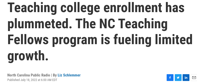 Liz Schlemmer’s report on WUNC.org today highlighted the shrinking number of teacher candidates in schools of education in North Carolina should not be a surprise.