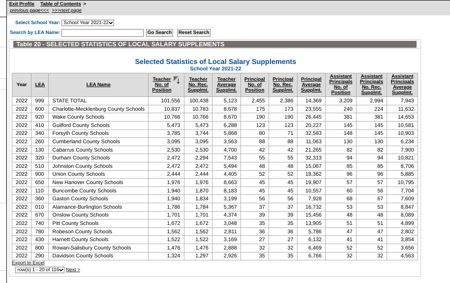 Charlotte-Meck and Wake County offer local teacher supplements of over $8,000. The state average is a little over $5,000.