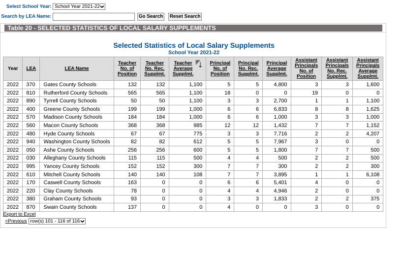 Look at the interactive table of 2021-2022 local supplements offered by each LEA for which a portion is shown.
