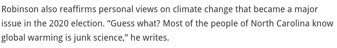 Yep. The man without the science degree who hasn’t looked at the history of this very important topic beyond his partisan lenses makes an uneducated claim that global warming is “junk science.” When well over 95% of the world’s experts are adamantly united that it is not junk science, Robinson goes further and claims that most North Carolinians “know that global warming is junk.