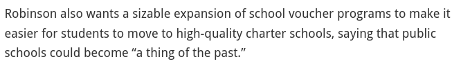So, Robinson wants to continue a way for taxpayer money to fund three different school systems in this state – traditional, charters, and private schools (vouchers)?