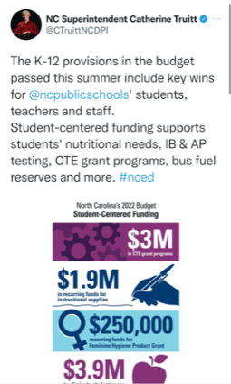 The day before the NC State Supreme Court was to hear arguments about funding the LEANDRO case directive last week, State Supt. Catherine Truitt sent out the following tweet (along with other data points).