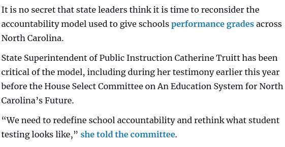 AND IN ALL OF THIS TALK ABOUT REDEFINING SCHOOL PERFORMANCE GRADES, TRUITT STILL HAS NOT ANNOUNCED ANY COMMITMENT TO THE LEANDRO COURT DECISION.