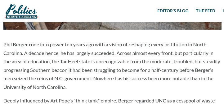 Pope bankrolls a few entities like the John Locke Foundation in the state that trumpet his libertarian ideals. He was also the first budget director for Gov. Pat McCrory, a man who cowered under people like Berger, Tillis, Moore, and others who sought and still seek to “reform” public education in NC. It’s also worth noting that Truitt was a senior education advisor to McCrory.