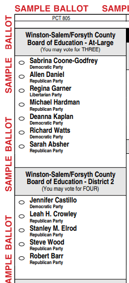 And when you vote for school board elections, you usually are given multiple choices and allowed to vote for more than one. In an “At-Large” election for a county/city seat like the local school board, a voter may get to choose UP TO FOUR CANDIDATES. That does not mean that you have to give four people your vote.
