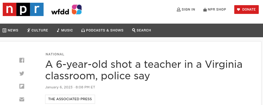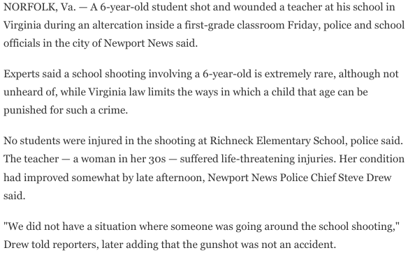 First grade. Not a high-schooler or college student. A six-year-old premeditatively brought a loaded gun to school, knew how it worked, and then targeted a teacher and shot her.