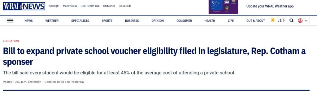 That’s from Phil Berger. The bill mentioned above sponsored by the former public school administrator Cotham expands the eligibility of vouchers so that the money can be “claimed” and thus fuel more “need” and therefore more money to be invested in it.