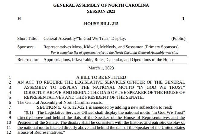 That’s what this bill wants to display prominently behind the dias in both chambers of the North Carolina General Assembly.