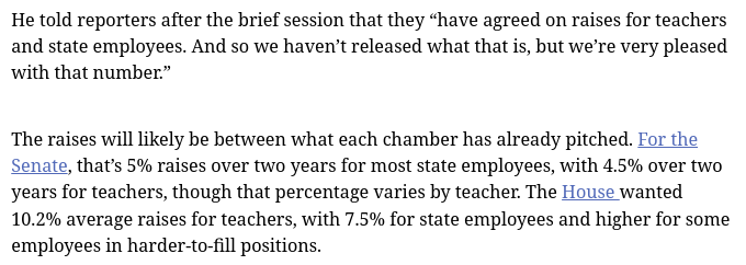 Remember that most state employees also receive longevity pay on a yearly basis – not teachers though. And that raise is also over the biennium which means that it is an “average” of 2.25% a year, if that. Oh, that also includes the step raises that were already in place.