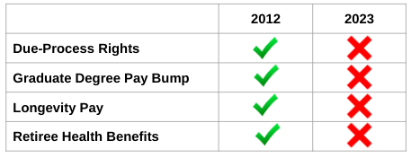 Graduate Degree Pay Bumps Removed – Because advanced degree pay is abolished, many potential teachers will never enter the field because that is the only way to receive a sizable salary increase to help raise a family or afford to stay in the profession. It also cripples graduate programs in the state university system because obtaining a graduate degree for new teachers would place not only more debt on teachers, but there is no monetary reward to actually getting it.