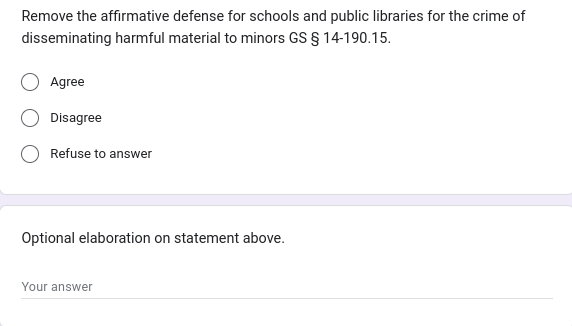 “Dear Representative, Happy New Year! We, Christian Perspective Representatives, Moms for Liberty North Carolina, and Pavement Education Project, sincerely hope this email finds you doing well. Thank you for your public service to the citizens of North Carolina. Our organizations represent 15,000 plus citizens, and we are passing along a collective outreach to gauge support on several important issues related to minors and public school education. We would greatly appreciate your feedback. Please tell us if you will support the items in the survey below. We thank you for your time and pray that you will continue to represent the people and protect our Constitution and fundamental parental rights.