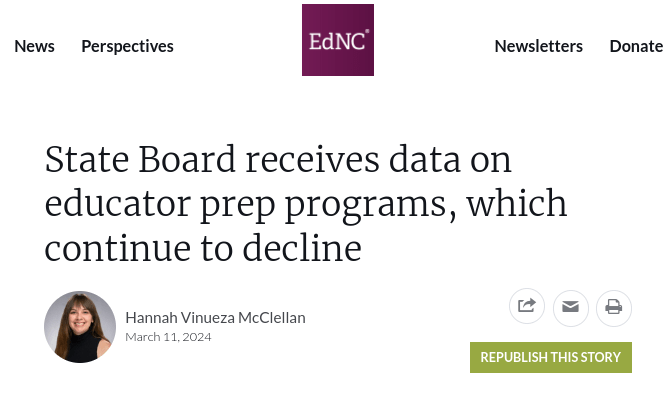 North Carolina’s Department of Instruction released its latest report on teacher retention and teacher candidates data. EdNC.org did a post on initial findings summing up quickly with: