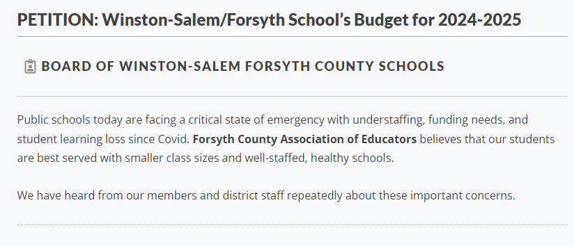 The Forsyth County Association of Educators is gathering signatures on their online petition to submit to the WSFCS School Board to address issues that affect all school environments.