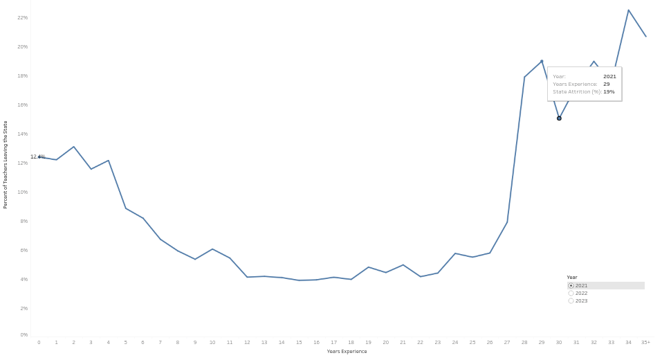The rates of teachers at year 28, 29, and 30 going into retirement is rather surprising. Yes, a teacher now can retire after 30 years of service with full pension and as of now health benefits. But look at the number of teachers who are leaving right before 30 years. That’s telling. They are using accrued sick days to account for time in the classroom (perfectly legal). What that may mean is that veteran teachers who could remain in the classroom for many more years are choosing to retire at the very first possibility. Considering that most career teachers who retire from the profession at 30 years are still in their 50’s, that’s even more telling.