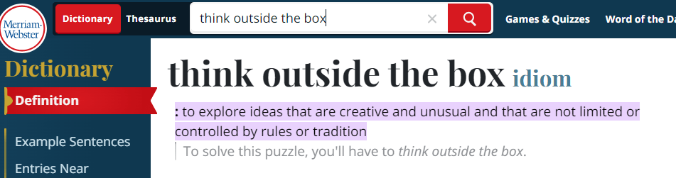 The idiom “thinking outside the box” is commonly used. It’s safe to say that most people have the same idea about what it means.